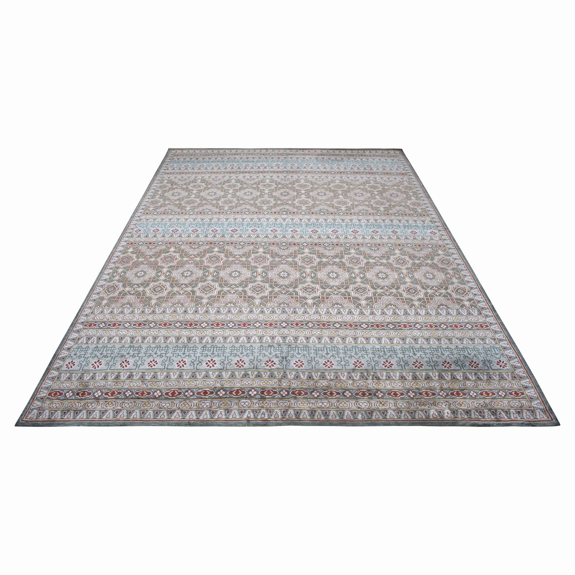 Blue Grey, Pure Silk Geometrical Transitional Handknotted 8.8x12.1Ft 264x368Cms Area Rug
