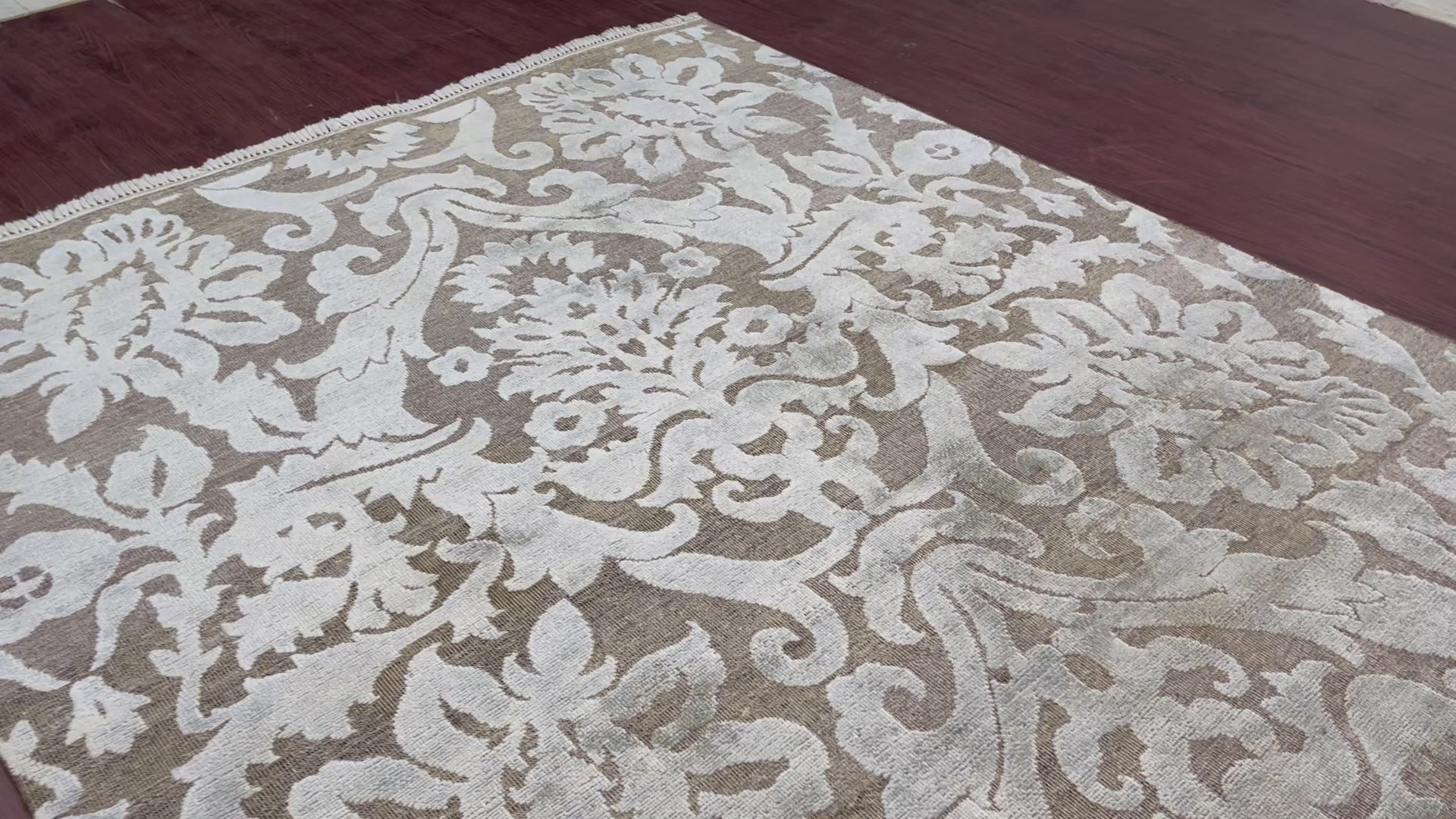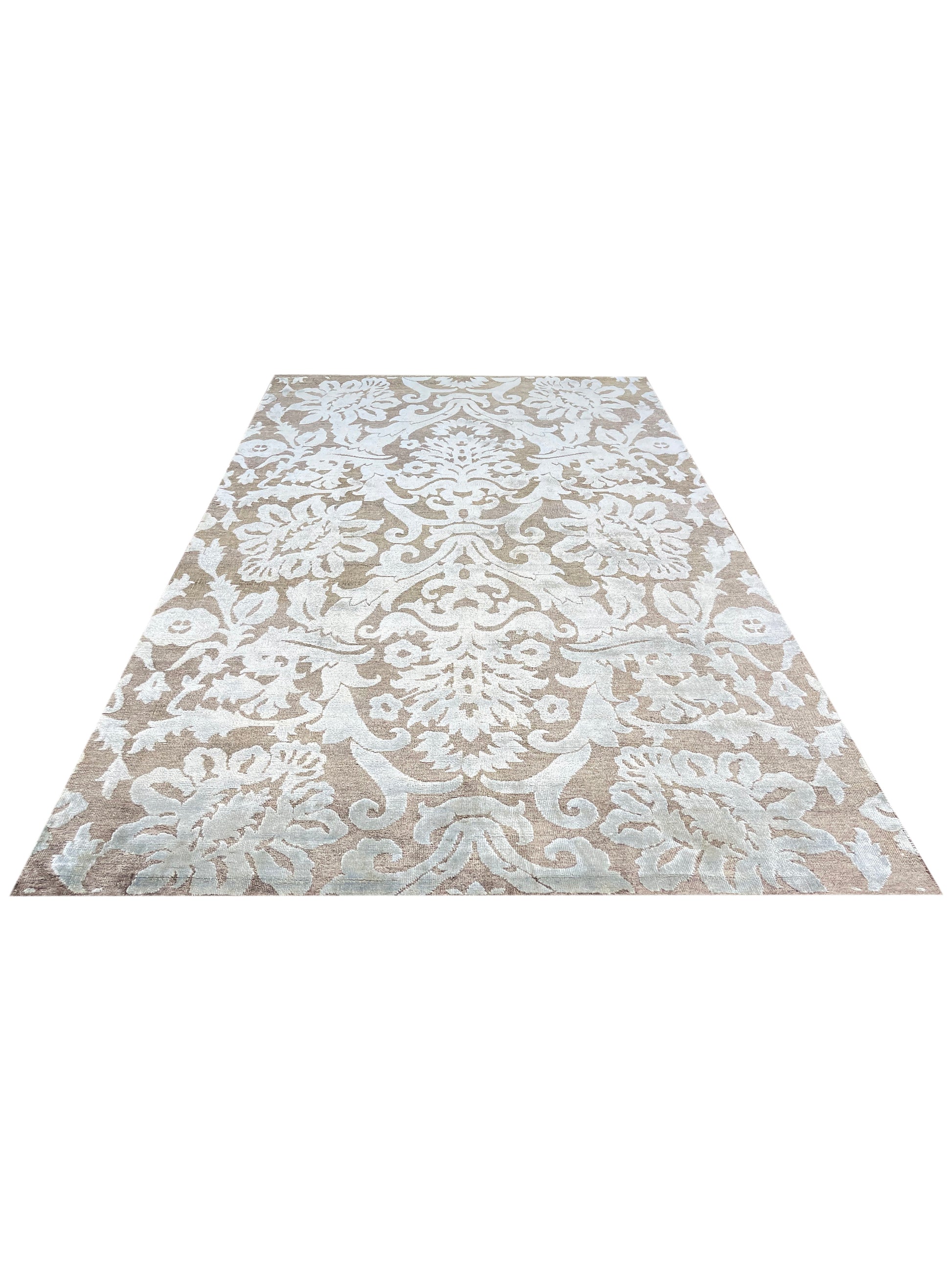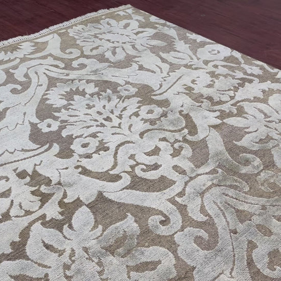 Brown and Grey, Silk and Wool Oxidized Modern Damask Handknotted 5.8x8.8Ft 171x262Cms Area Rug