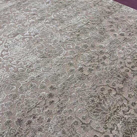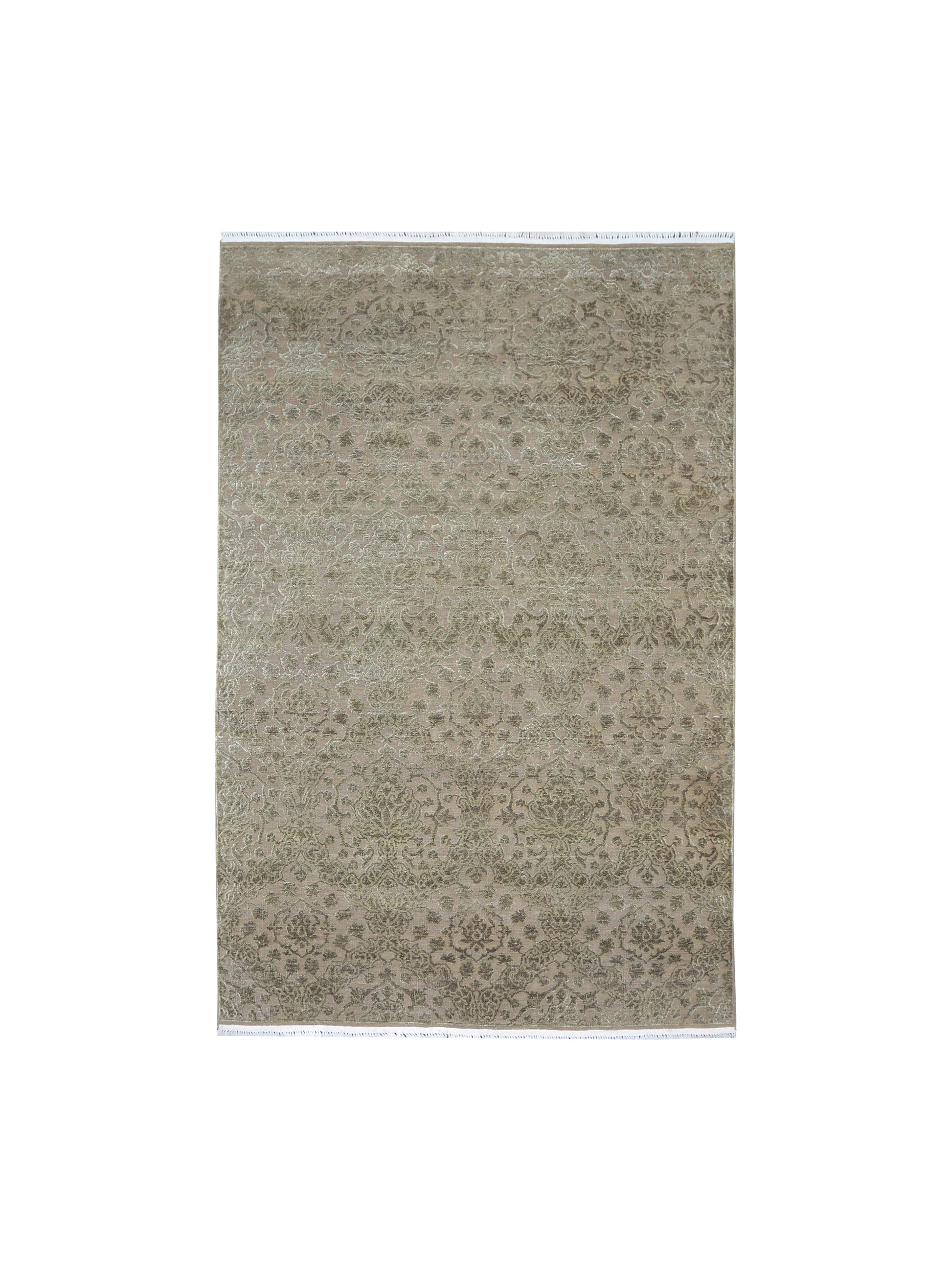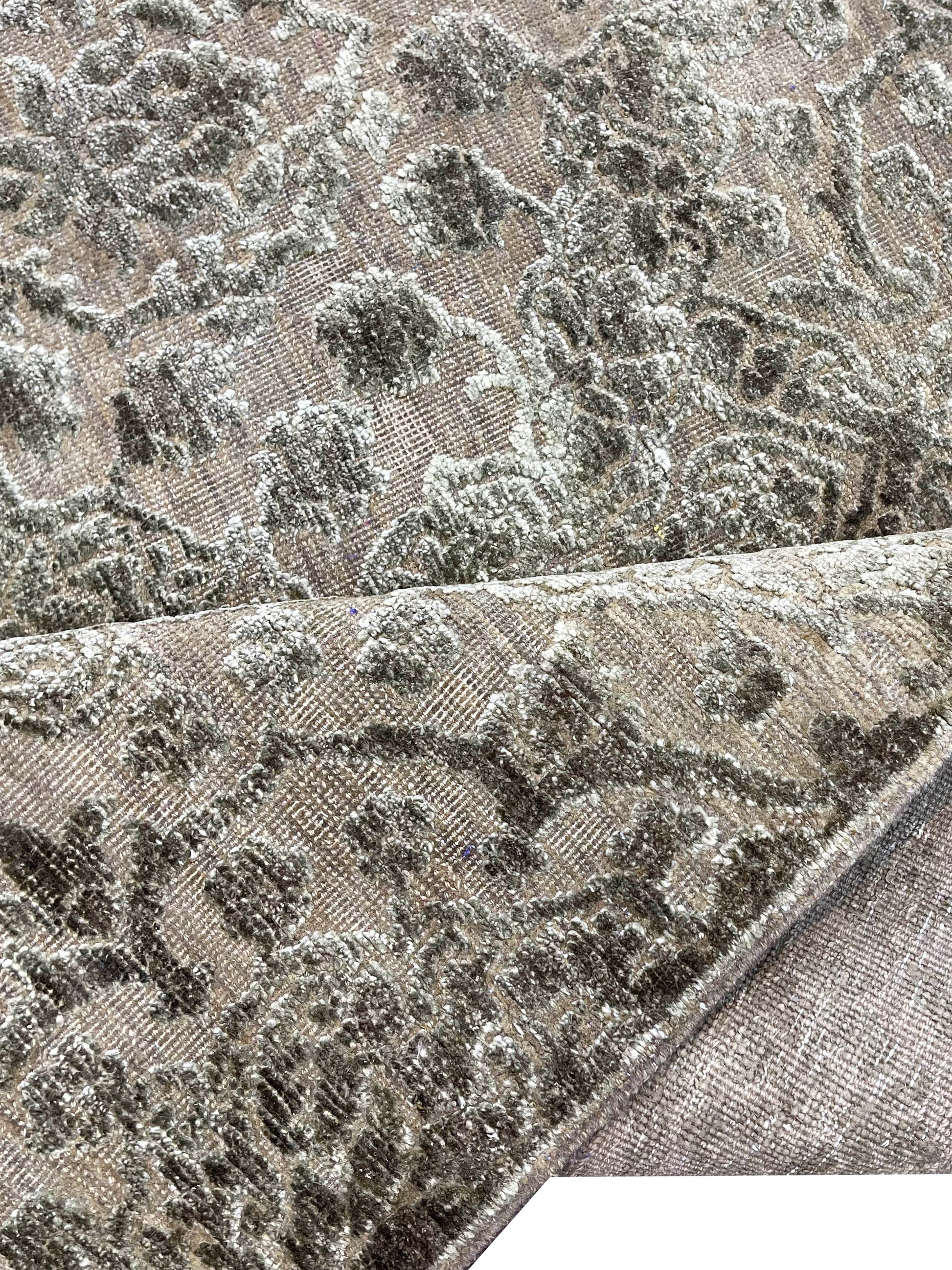 Camel Brown and Silver, Silk and Wool Oxidized Modern Damask Handknotted 6.0x8.11Ft 182x270Cms Area Rug