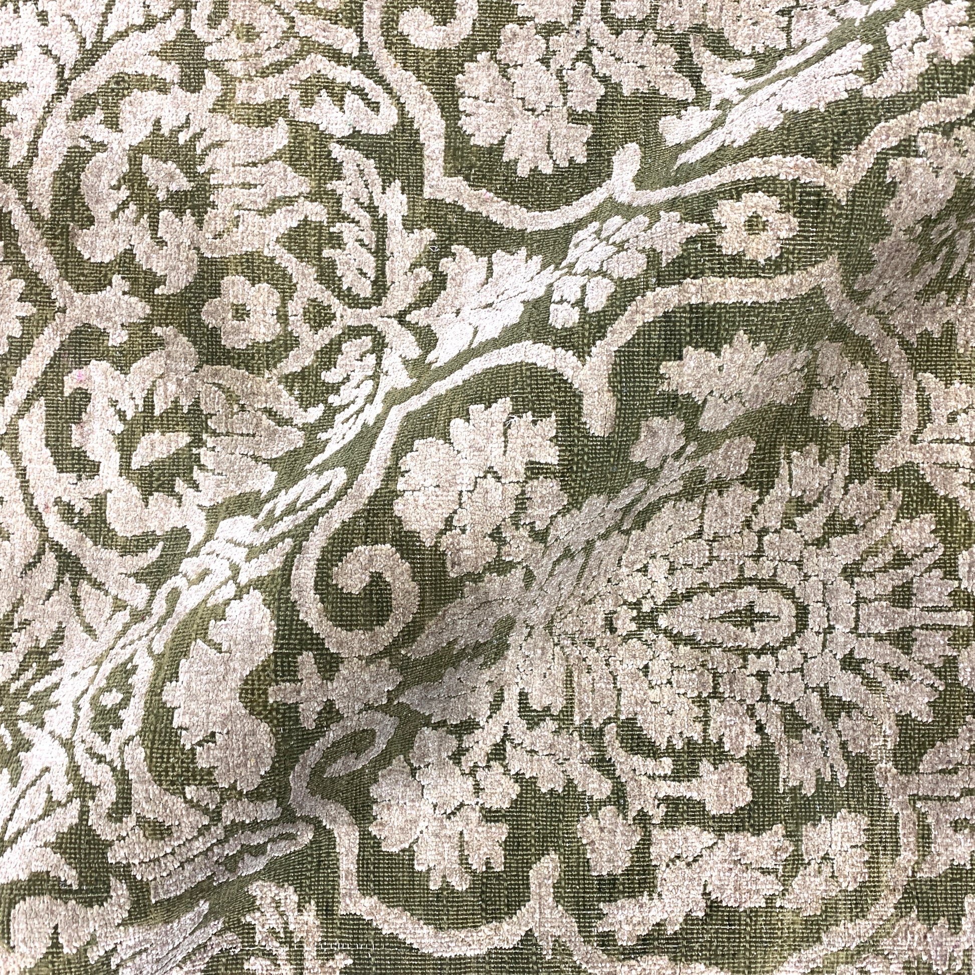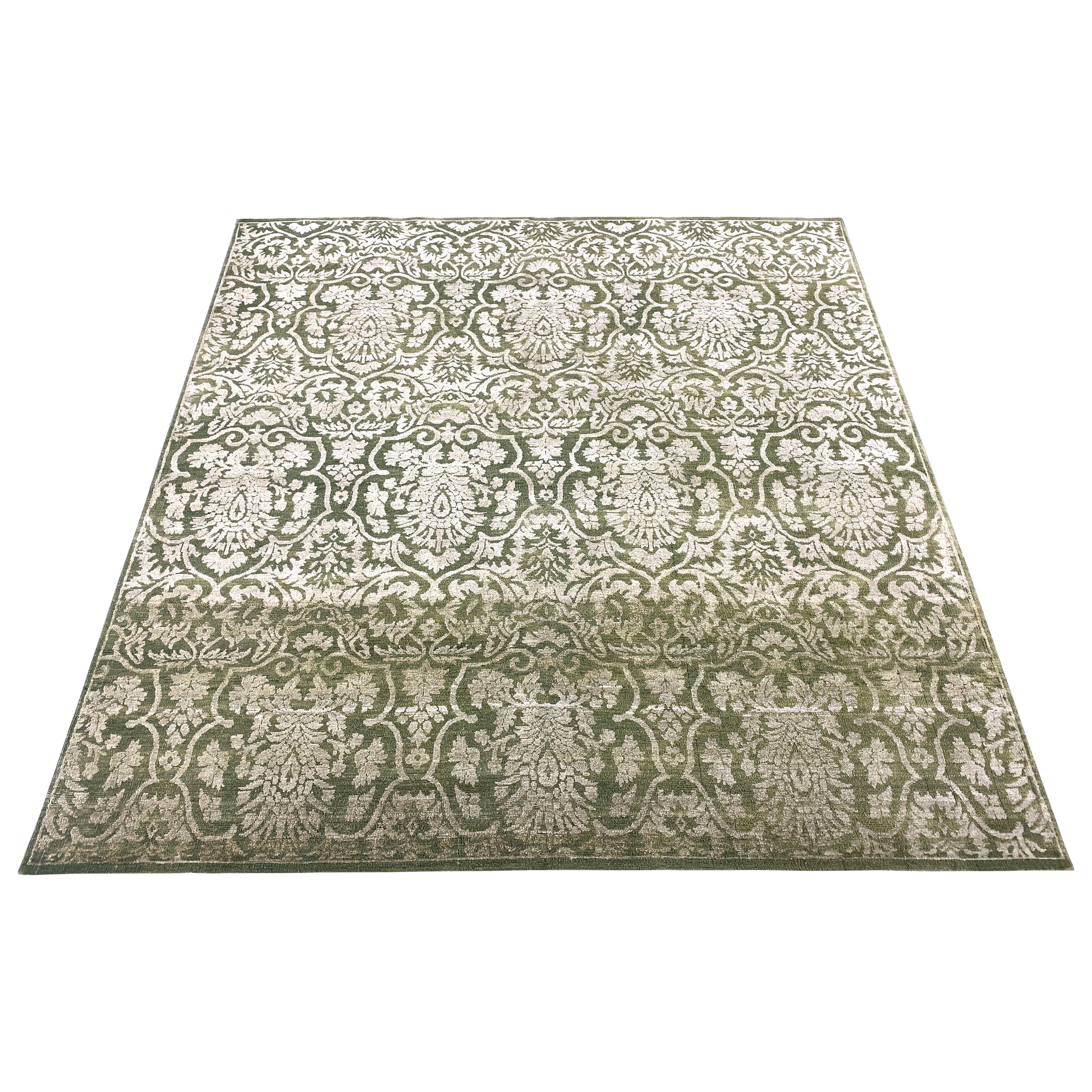 Green and Ivory, Silk and Wool Oxidized Assorted Transitional Handknotted 7.10x8.7Ft 240x262Cms Area Rug