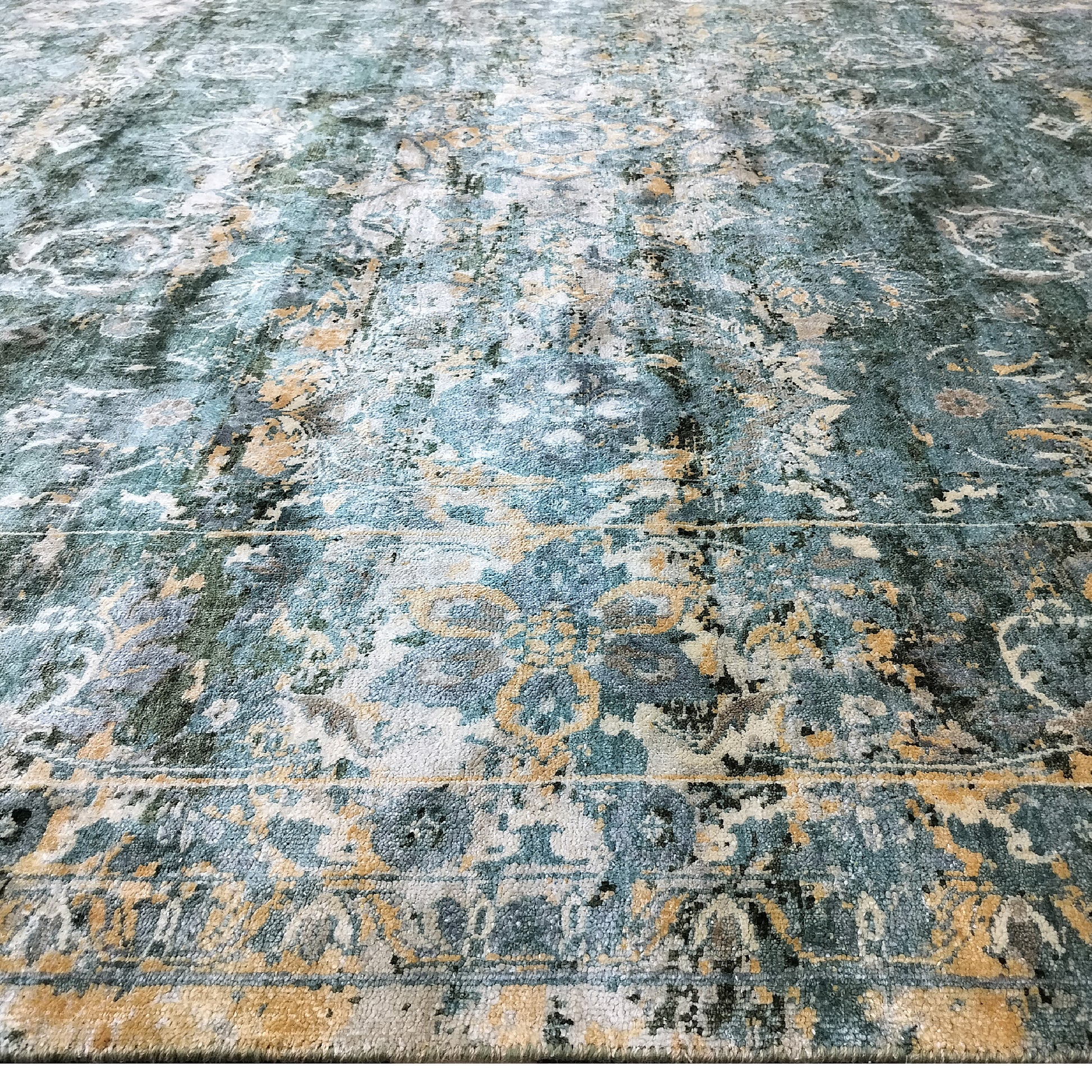 Green, Gold and Ivory Pure Silk Transitional Persian Handknotted 9.1x12.2ft 278x370Cms Area Rug