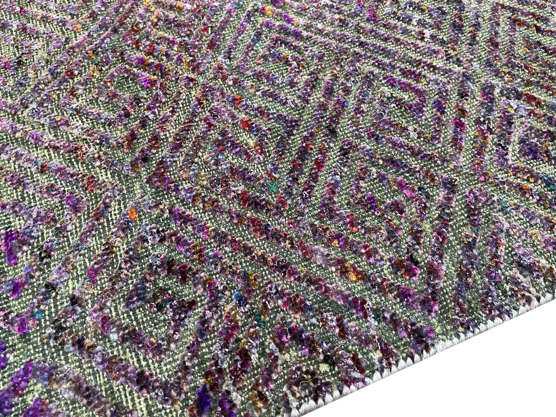 Modern Geometrical Handknotted Sari Silk and Wool Oxidized Area Rug