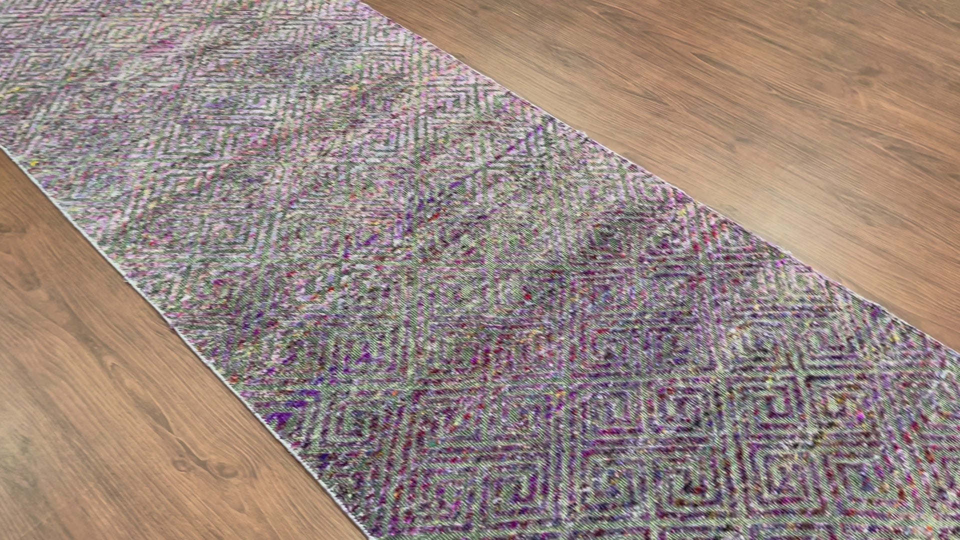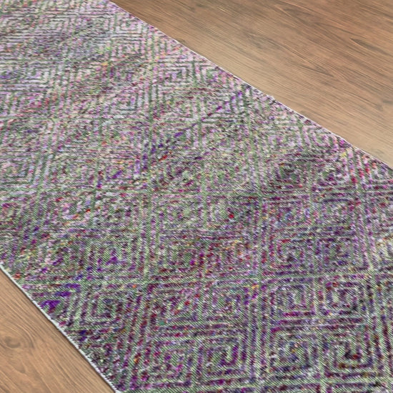 Grey and Purple, Sari Silk and Wool Oxidized Modern Geometrical Handknotted 2.9x9.10Ft 80x299Cms Area Rug