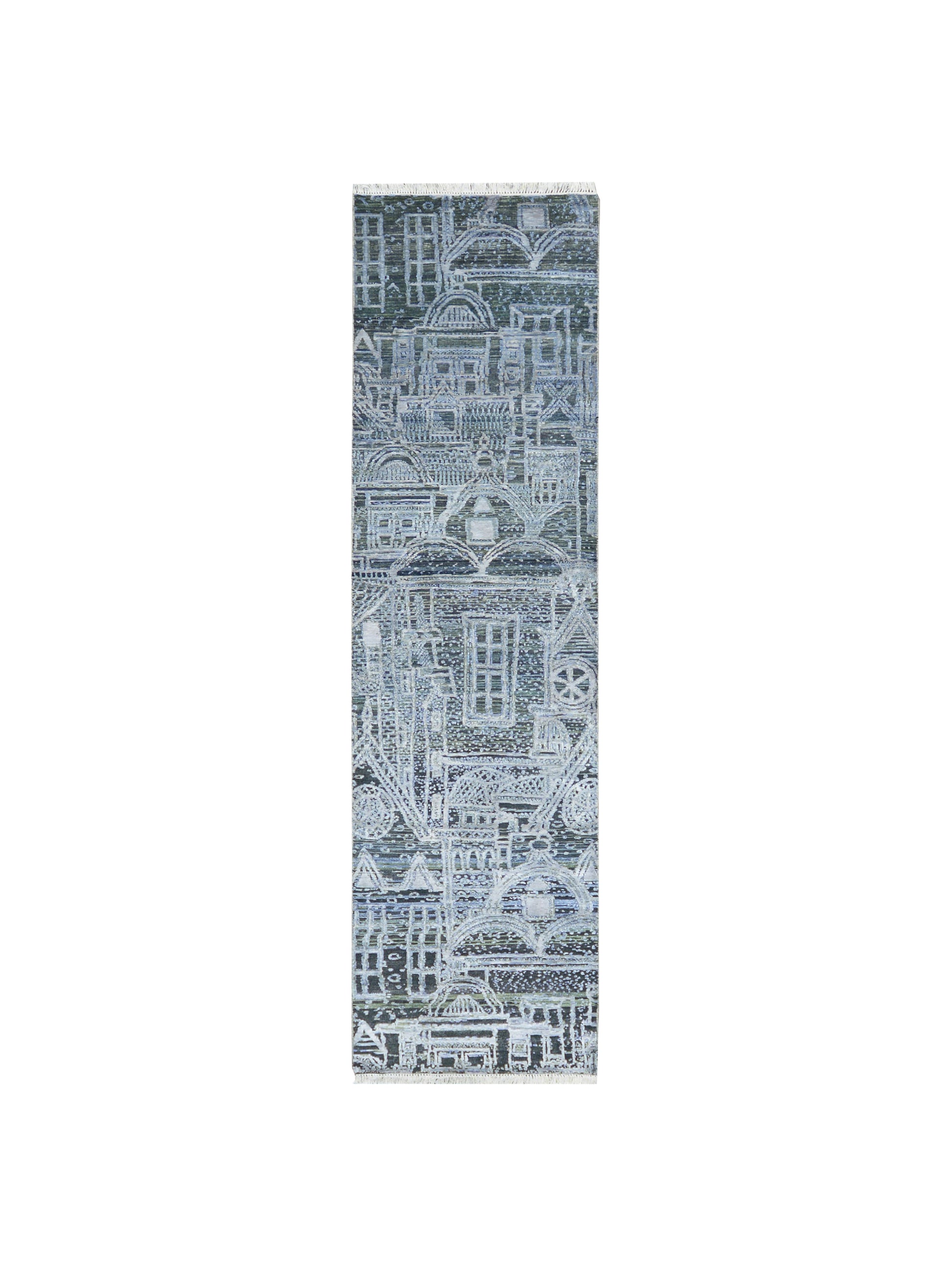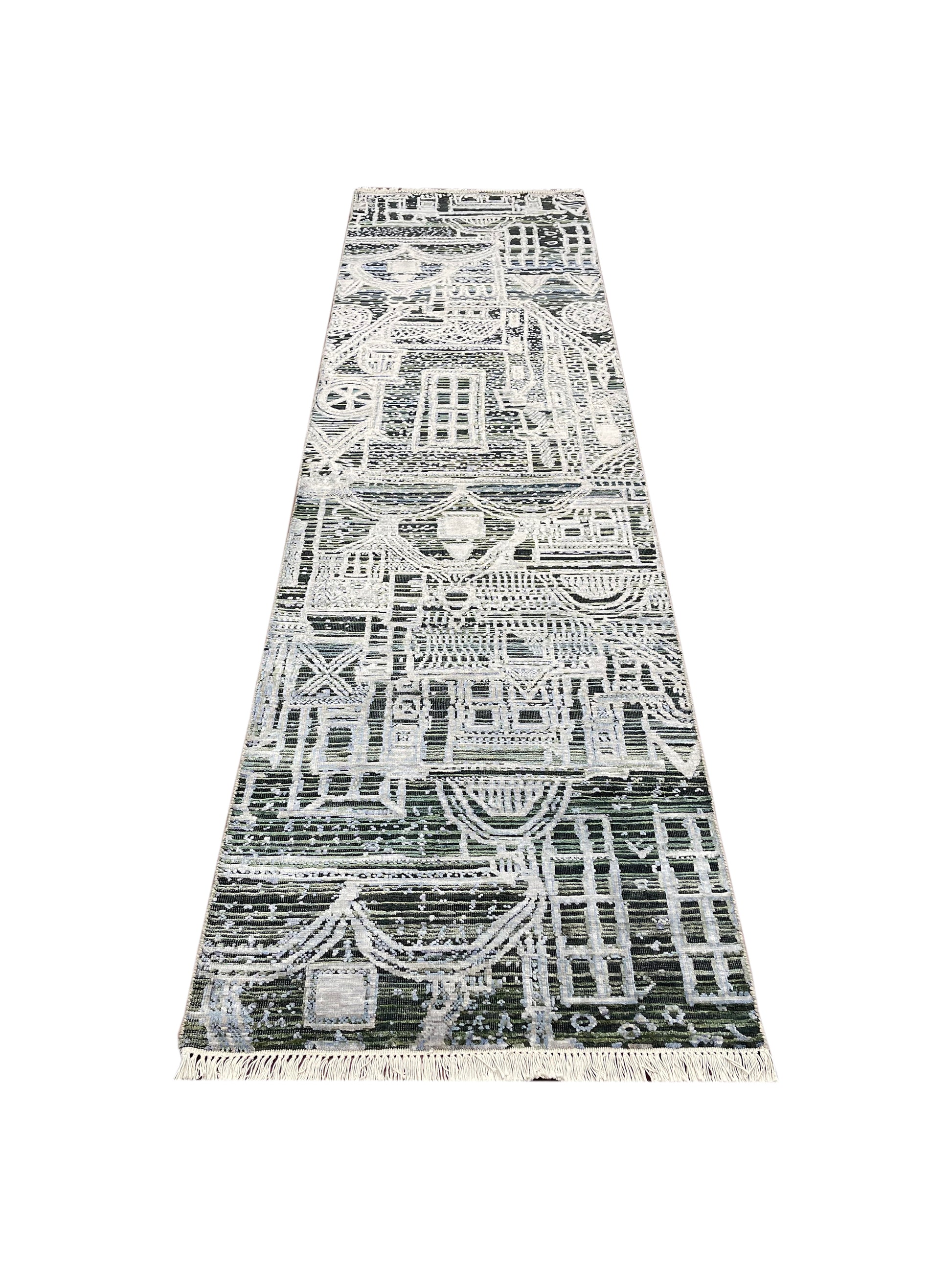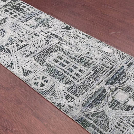 Grey and Silver, Viscose and Wool Oxidized Modern Abstract Handknotted 2.7x9.9Ft 78x296Cms Area Rug