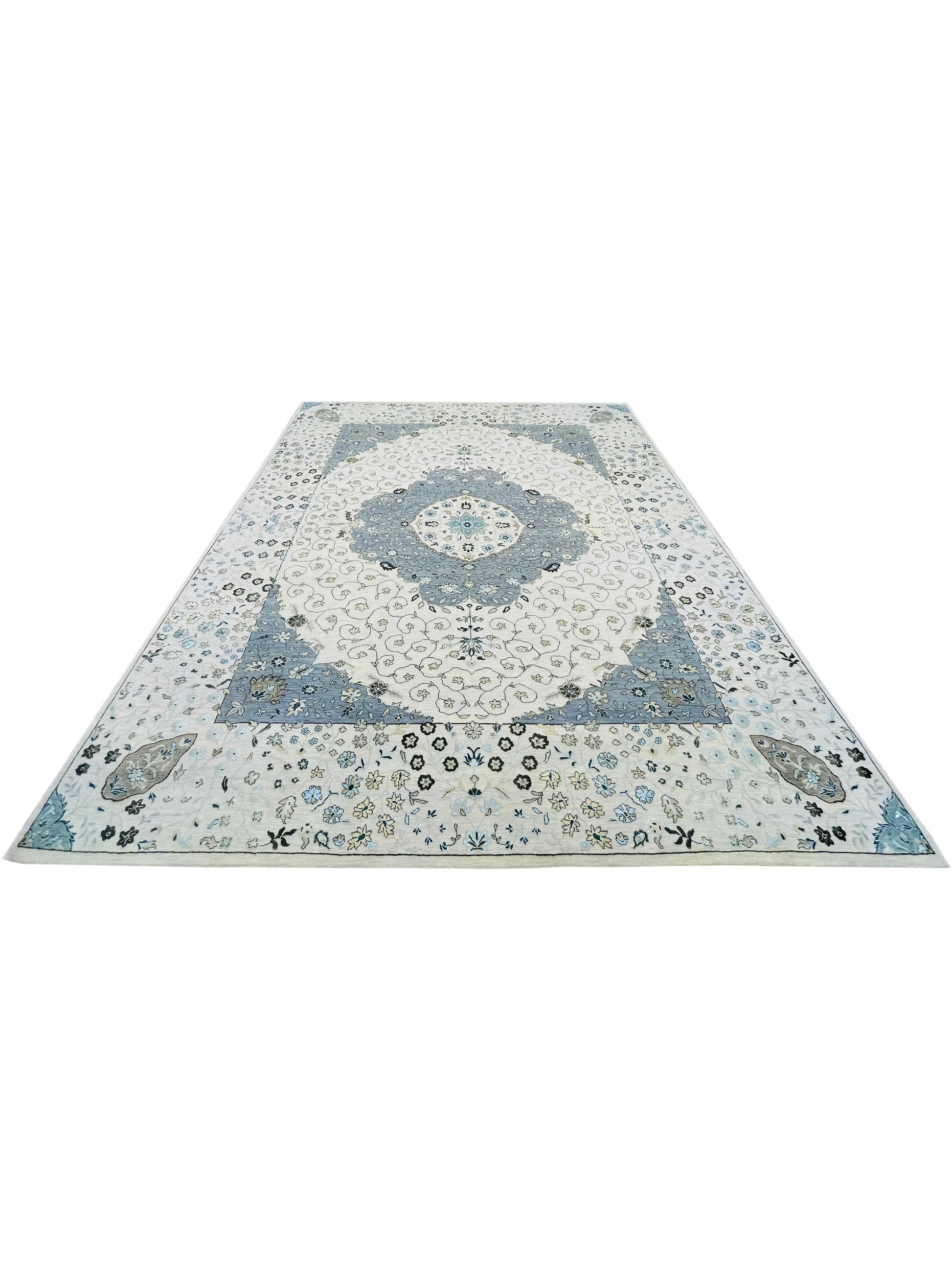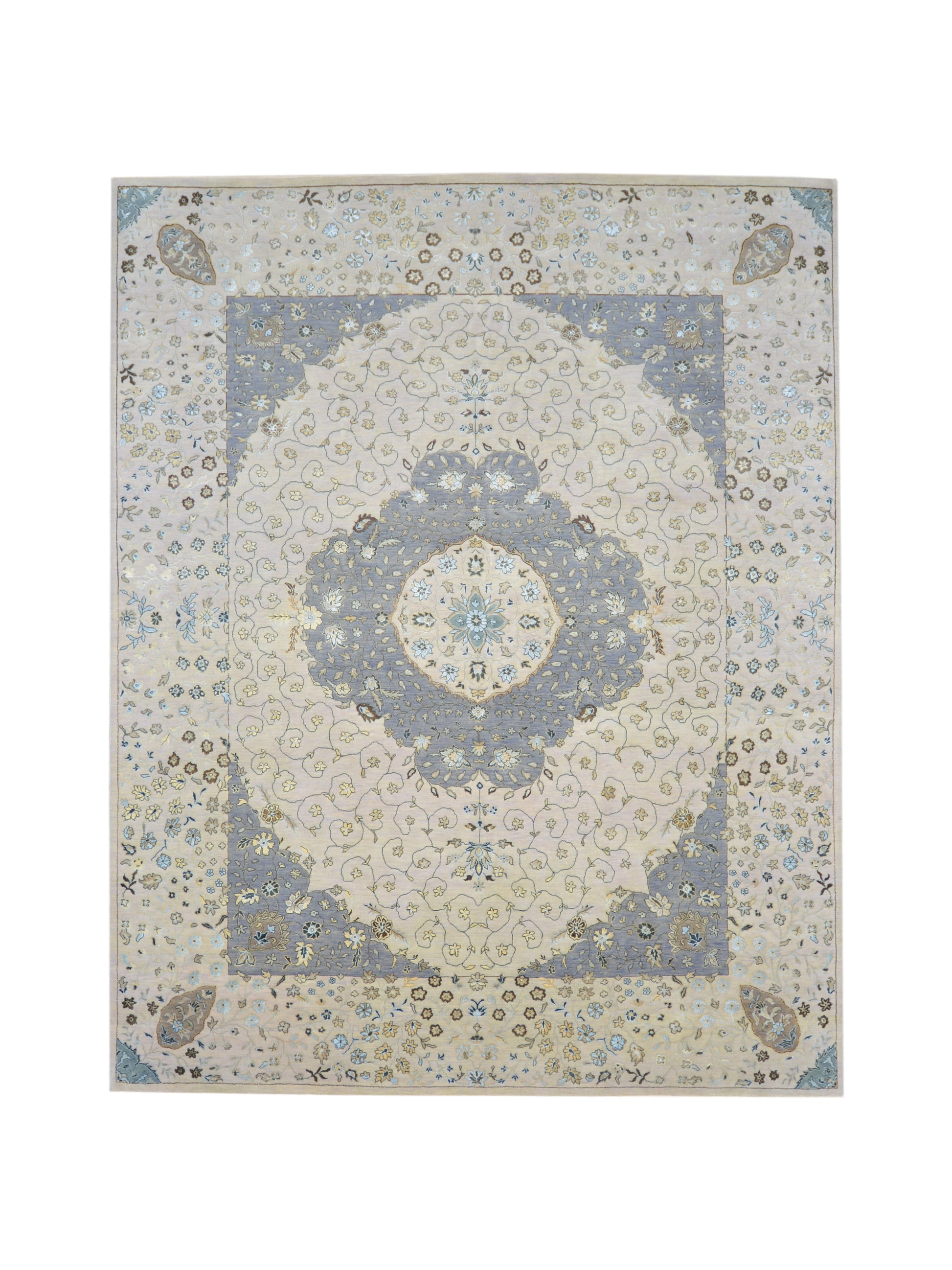 Ivory and Grey, Silk and Wool Hi-Lo Traditional Handknotted 8.0x10.2Ft 244x308Cms Area Rug