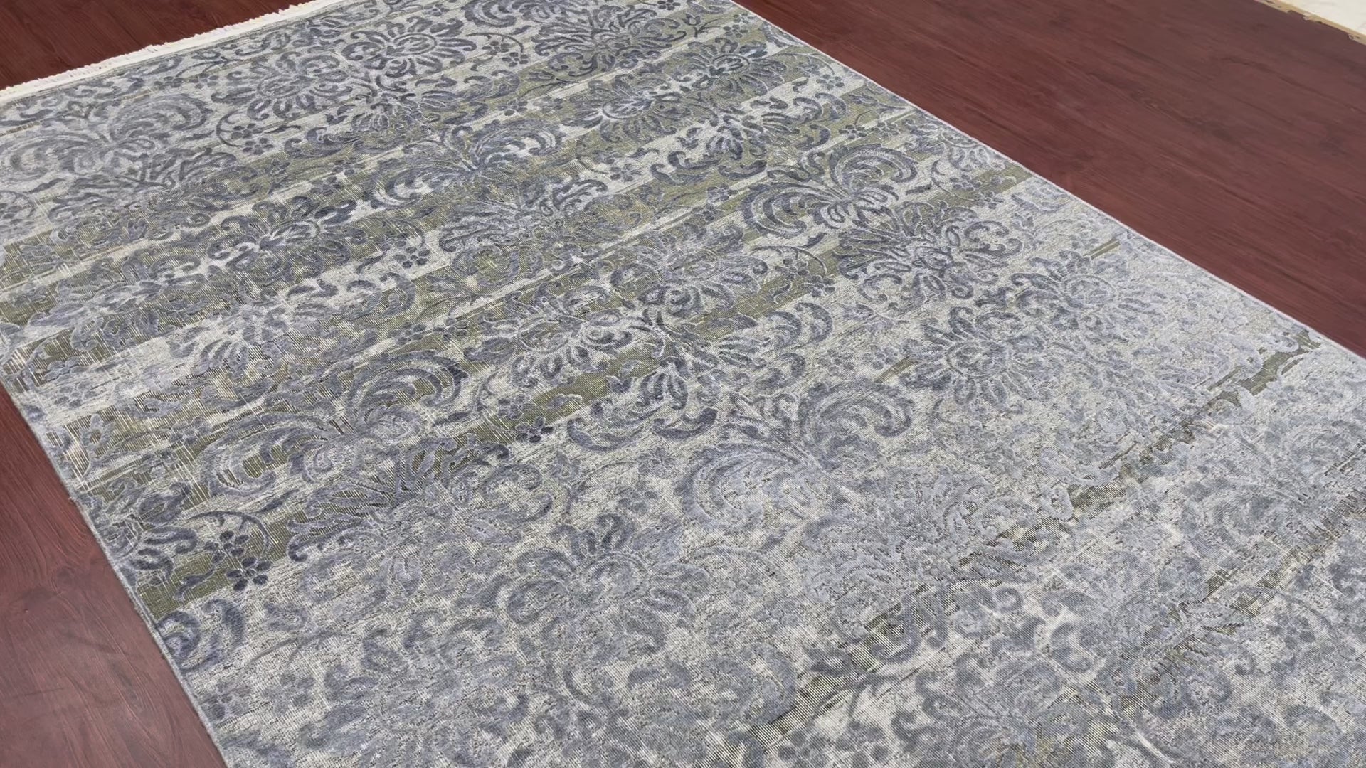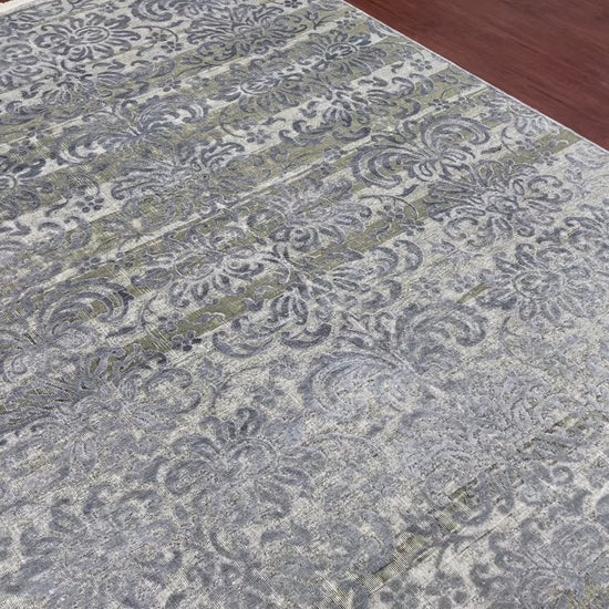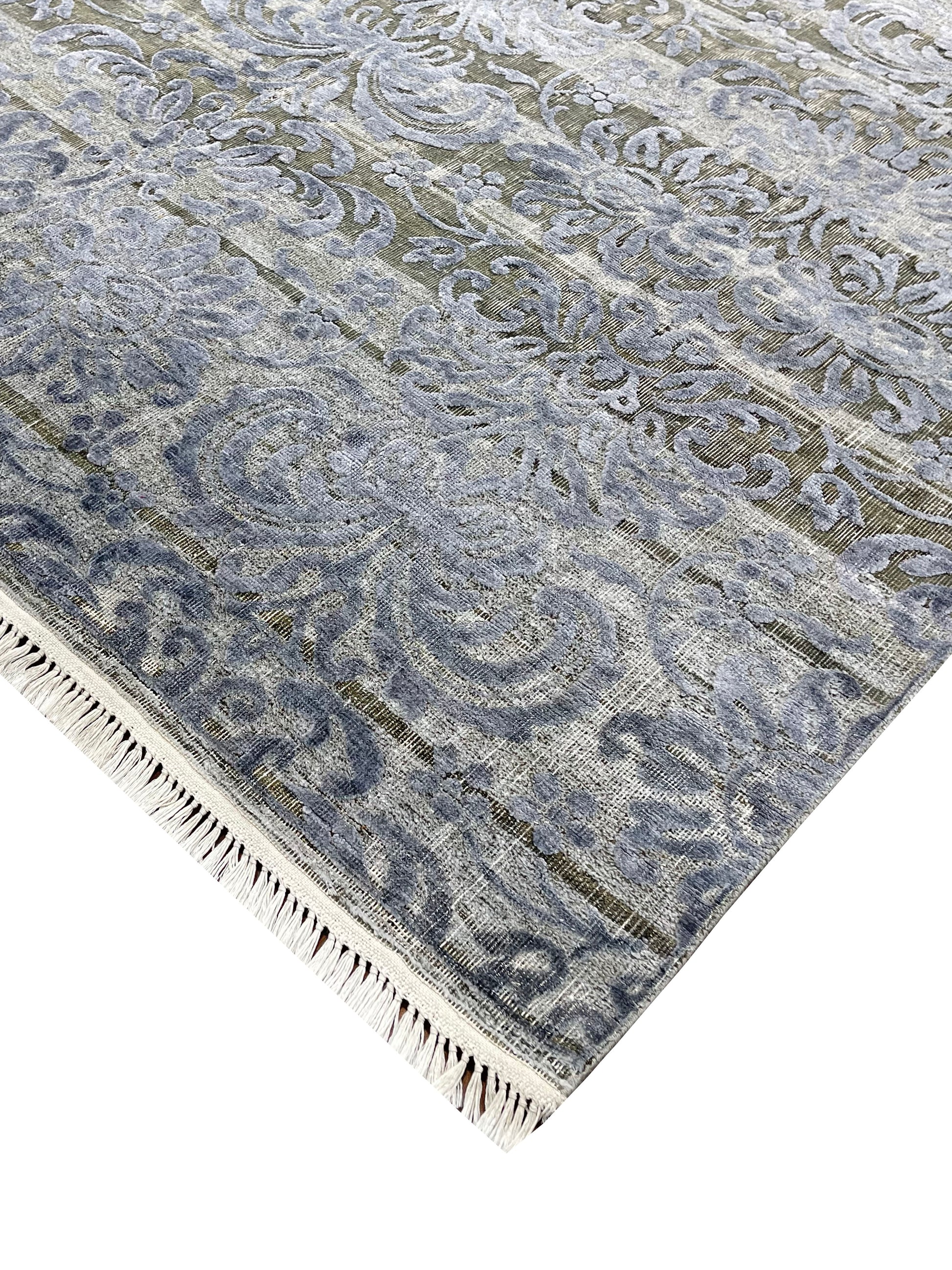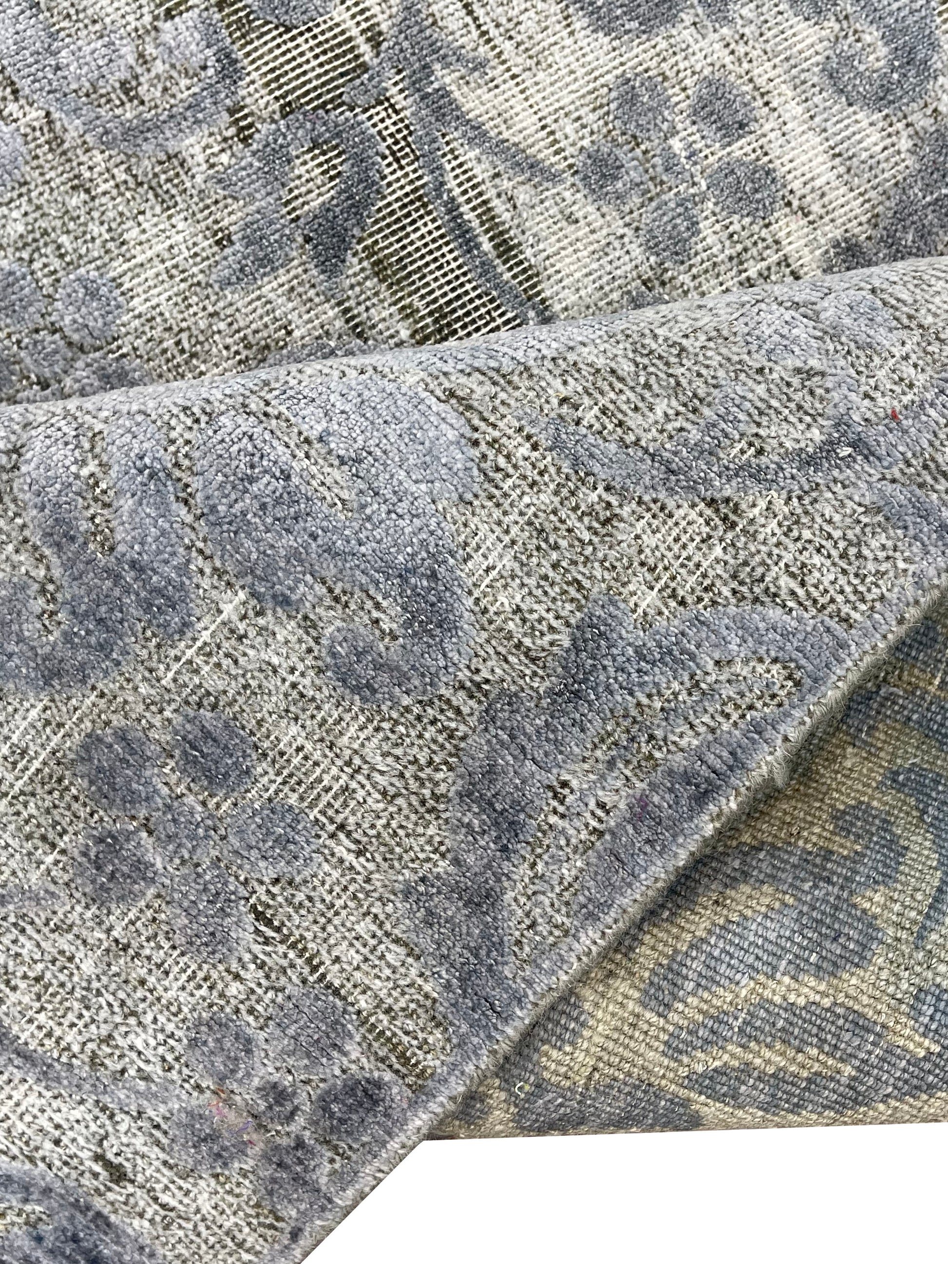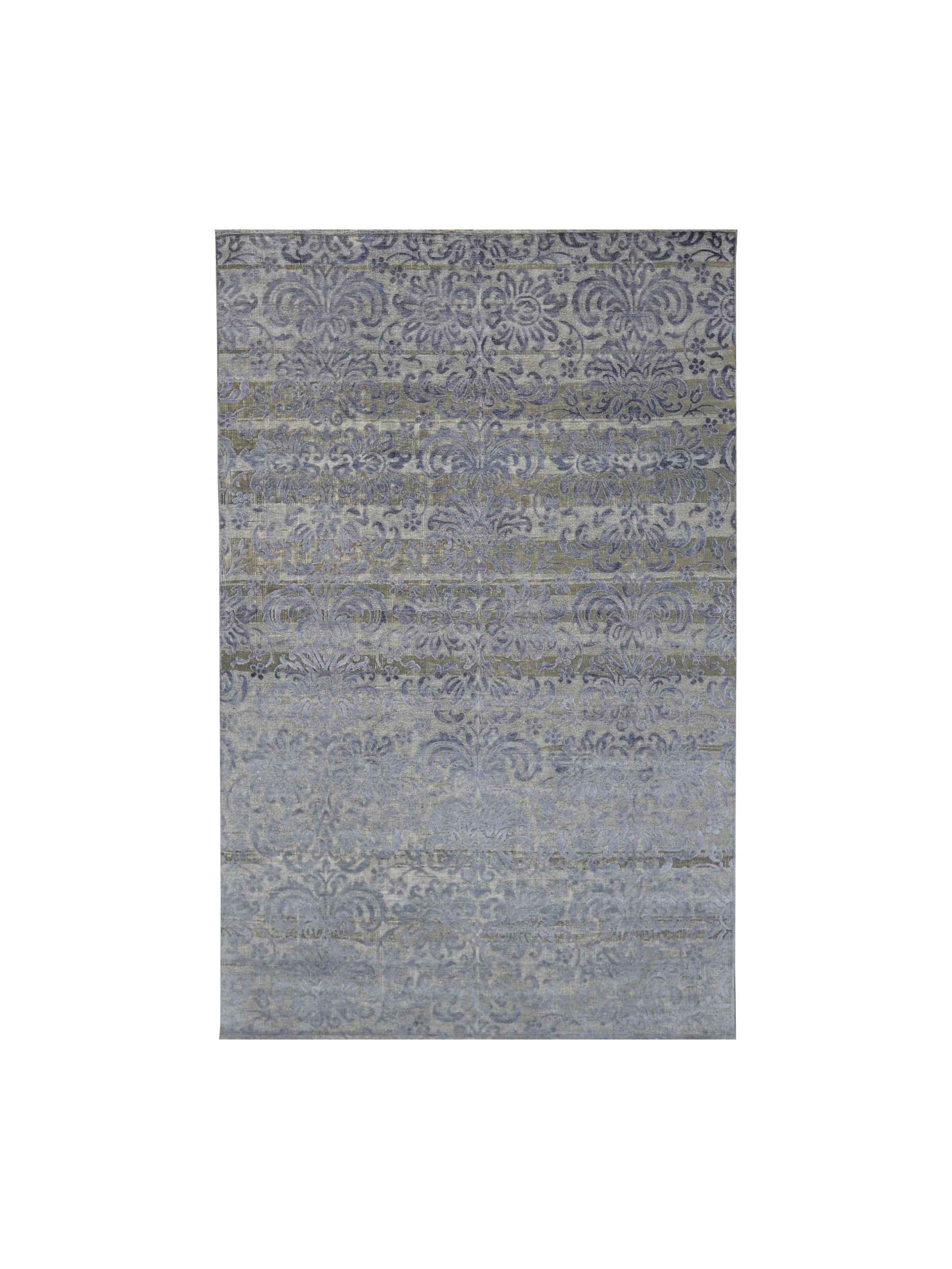 L.Blue and Grey, Silk and Wool Oxidized Modern Damask Handknotted 6.0x8.11Ft 183x271Cms Area Rug
