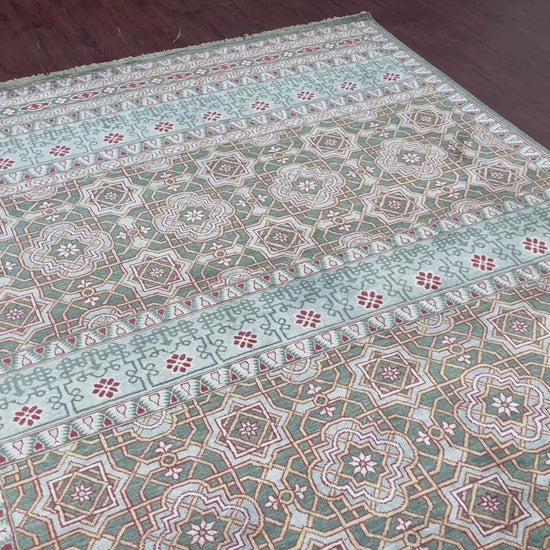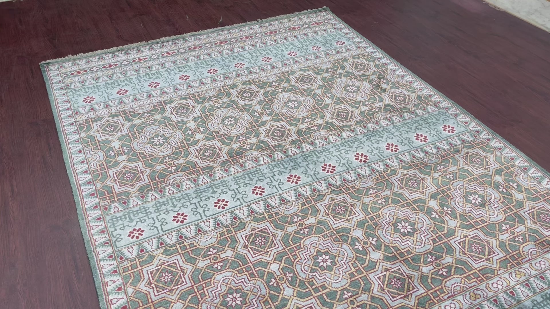 Blue and Green Pure Silk Transitional Geometrical Handknotted 5.11x9.0 Area Rug