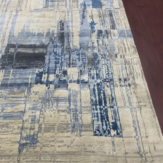 Grey, Blue and Ivory Silk ans Wool Modern Textured Handknotted 8.10x12.3Ft 270x374Cms Area Rug