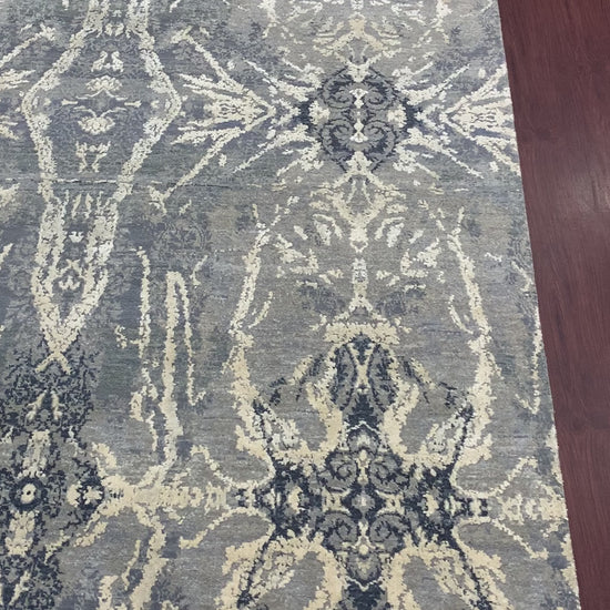 Ivory, Grey and Blue Silk and Wool Modern Abstract Handknotted Area Rug