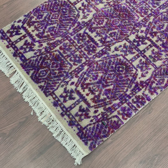 Purple and Ivory, Sari Silk and Wool Oxidized Transitional Handknotted 2.7x9.11Ft 79x303Cms Area Rug