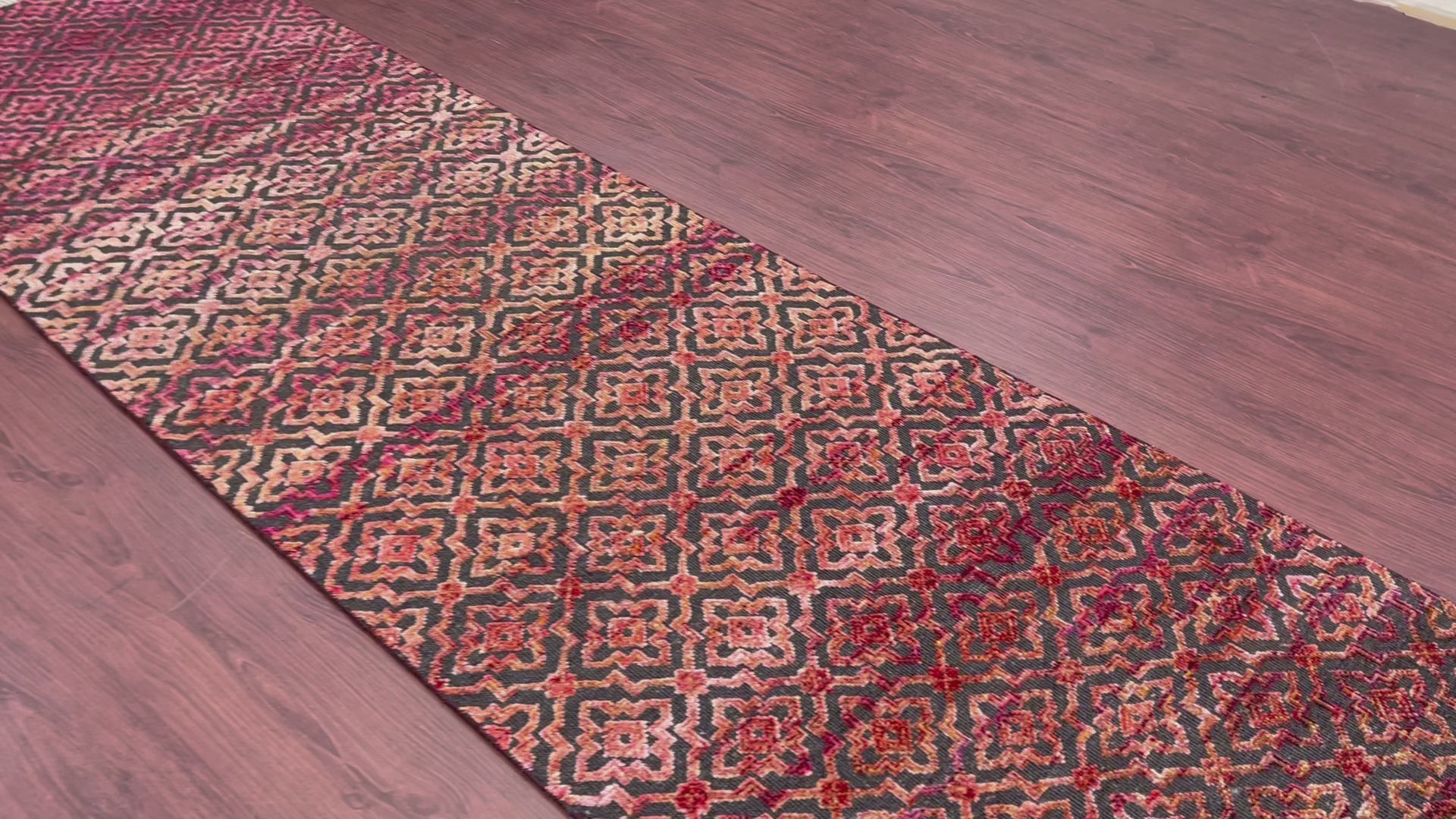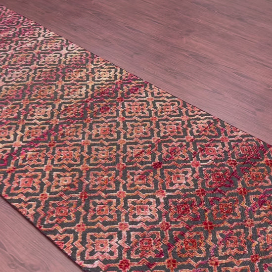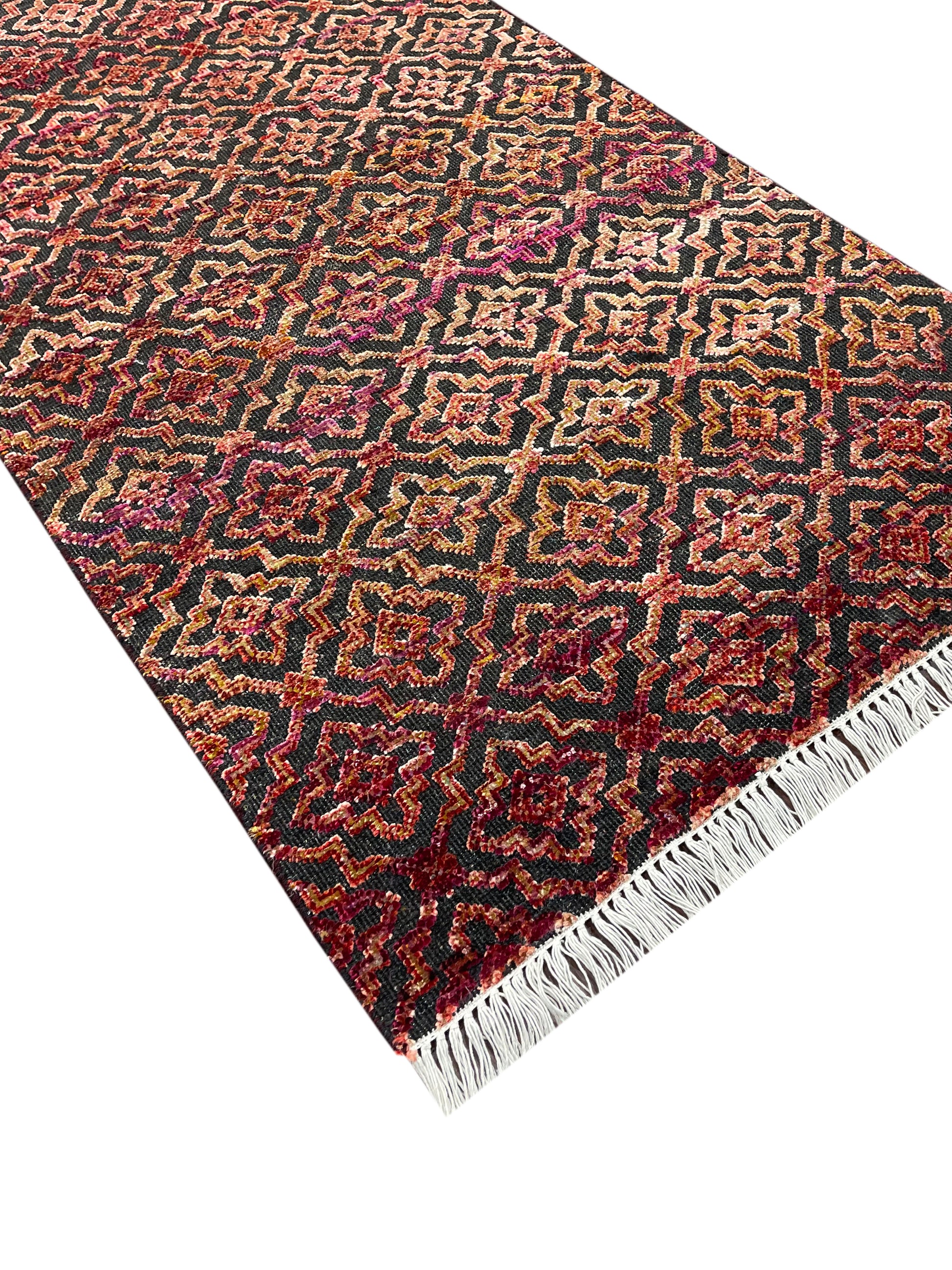 Red and Black, Sari Silk and Wool Oxidized Modern Damask Handknotted 2.10x11.8Ft 85x355Cms Area Rug