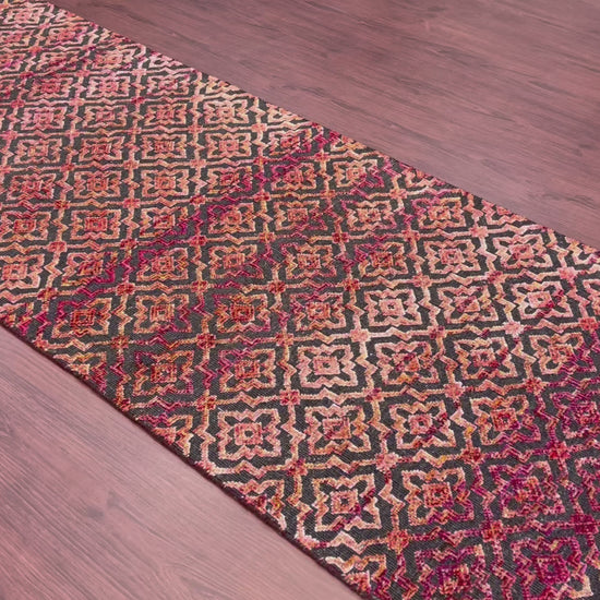 Red and Black, Sari Silk and Wool Oxidized Modern Damask Handknotted 2.10x11.8Ft 86x355Cms Area Rug