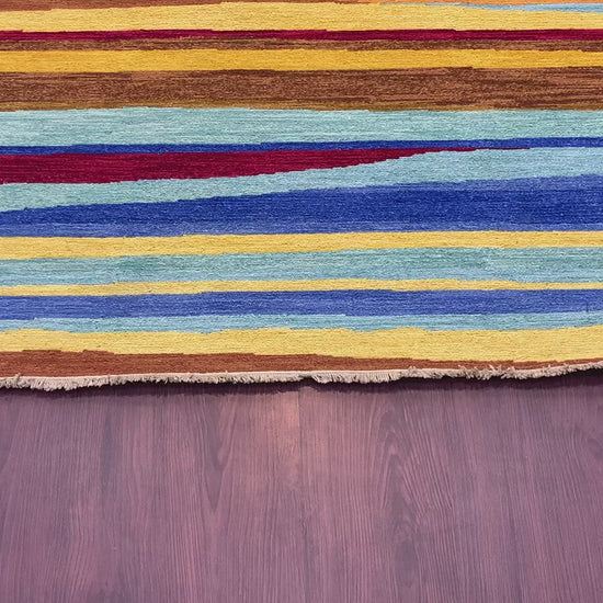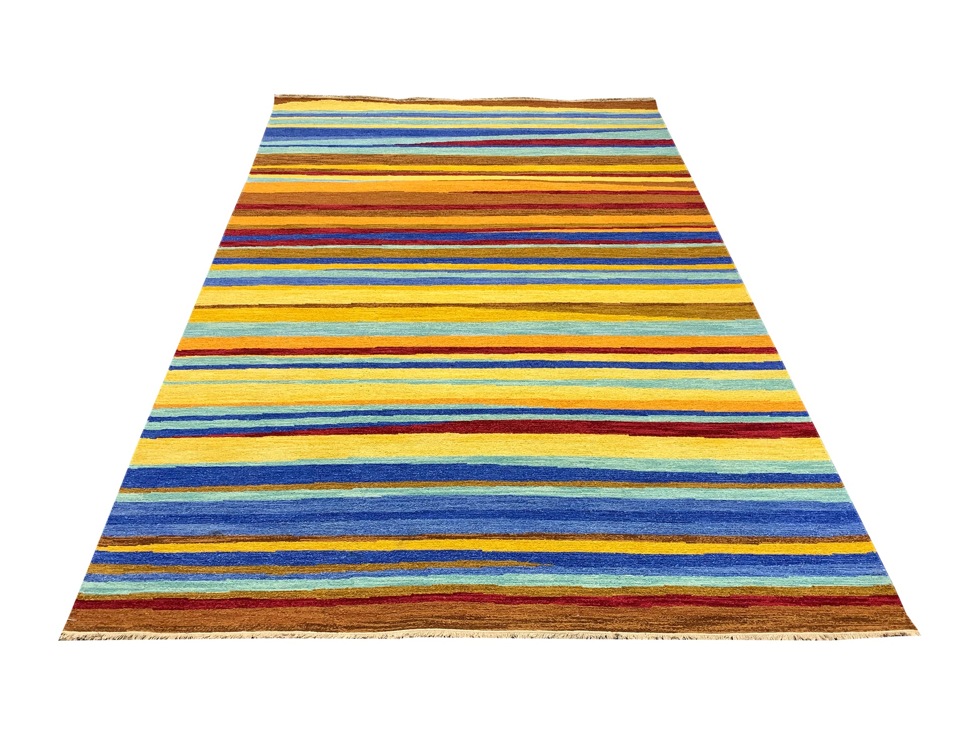 Yellow and Multy, Pure Wool Lo-Pile Modern Strips Soumak Handknotted 6.2x9.2Ft 187x279Cms Area Rug
